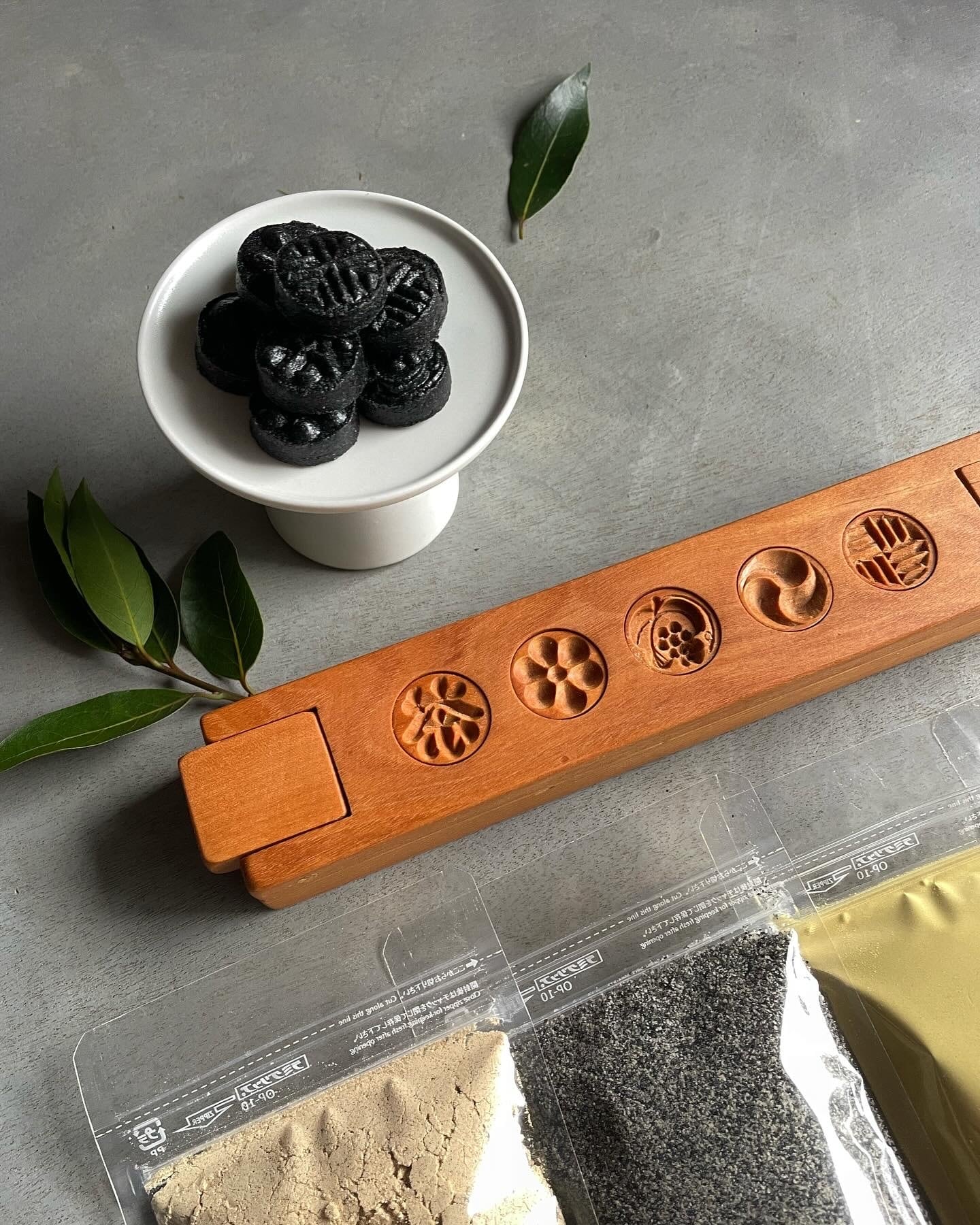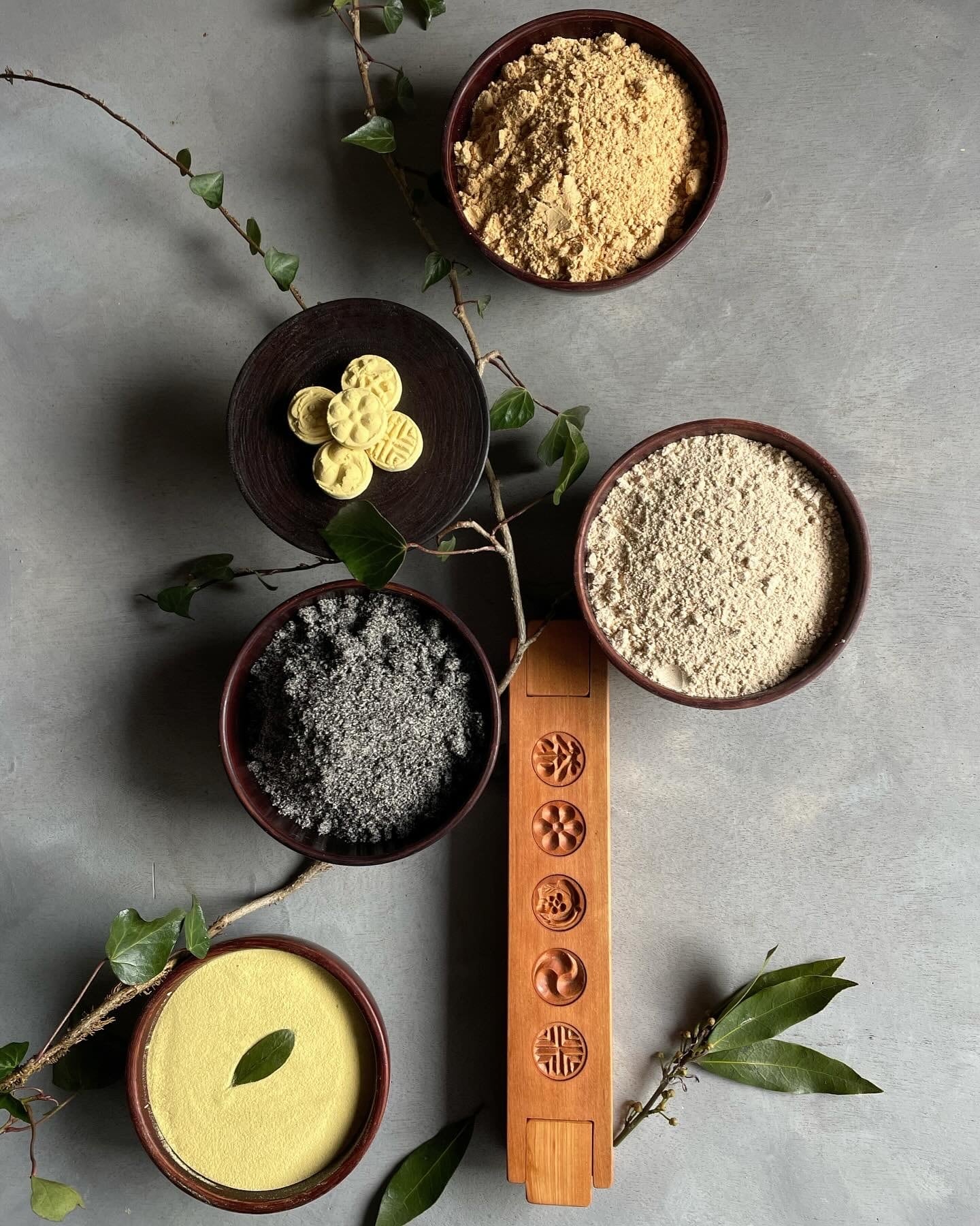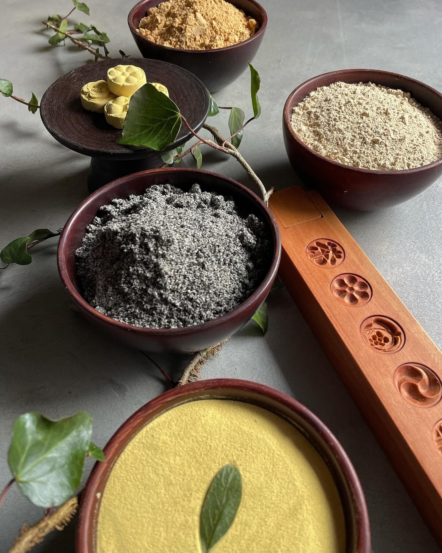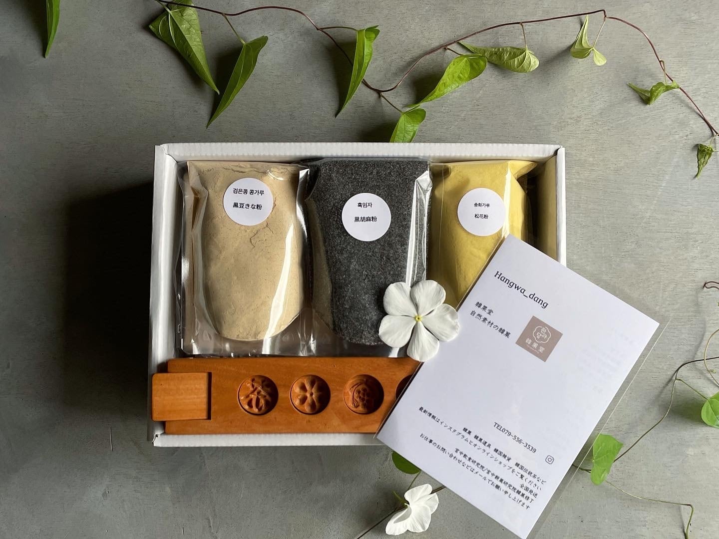 ○韓国産松花粉(80g)、韓国産黒胡麻粉(100g)、丹波篠山産農薬不使用黒豆きな粉(100g)、きな粉京都産農薬不使用(100g)、白茶食粉(200g)、梔子粉(20g)、百年草粉(20g)